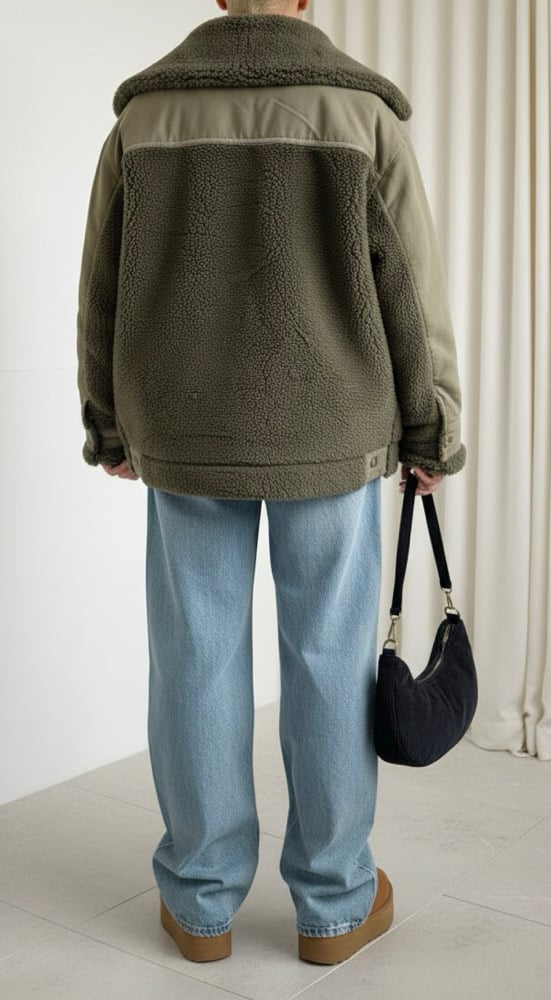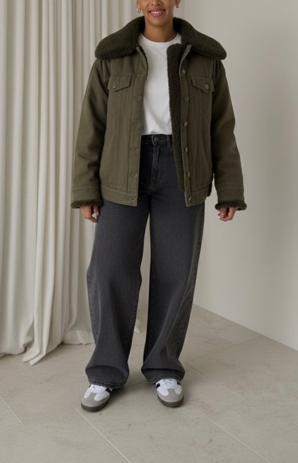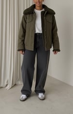 Veste style aviateur avec grand col sherpa. Fermeture boutonnée sur le devant. Détails de deux poches poitrine à rabat et boutons pression. Mix de texture avec extérieur en coton et intérieur effet moumoute .